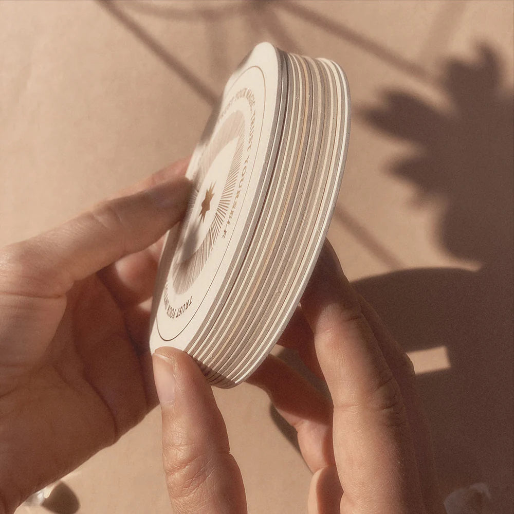 -Unlike conventional card decks, we deliberately avoided artificial coatings when choosing the paper for the cards. This preserves a natural connection with the cards that can be felt with every touch.
