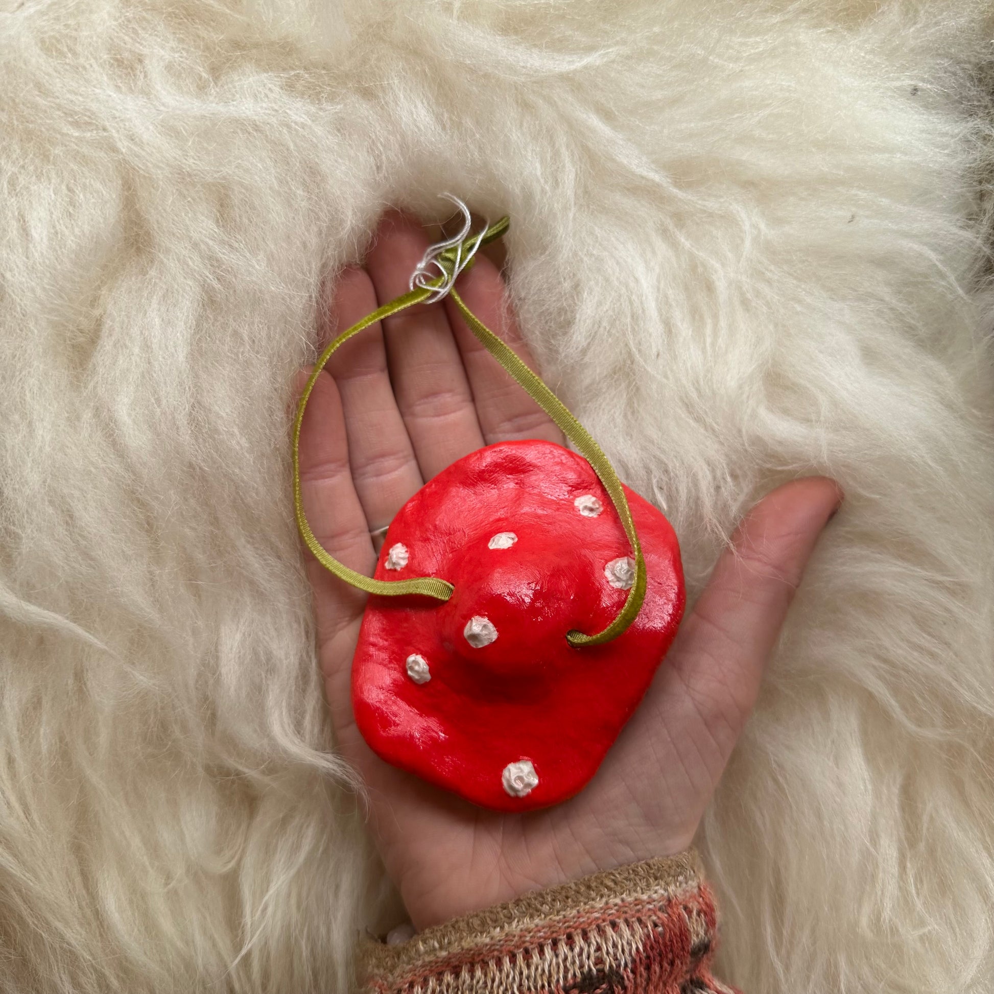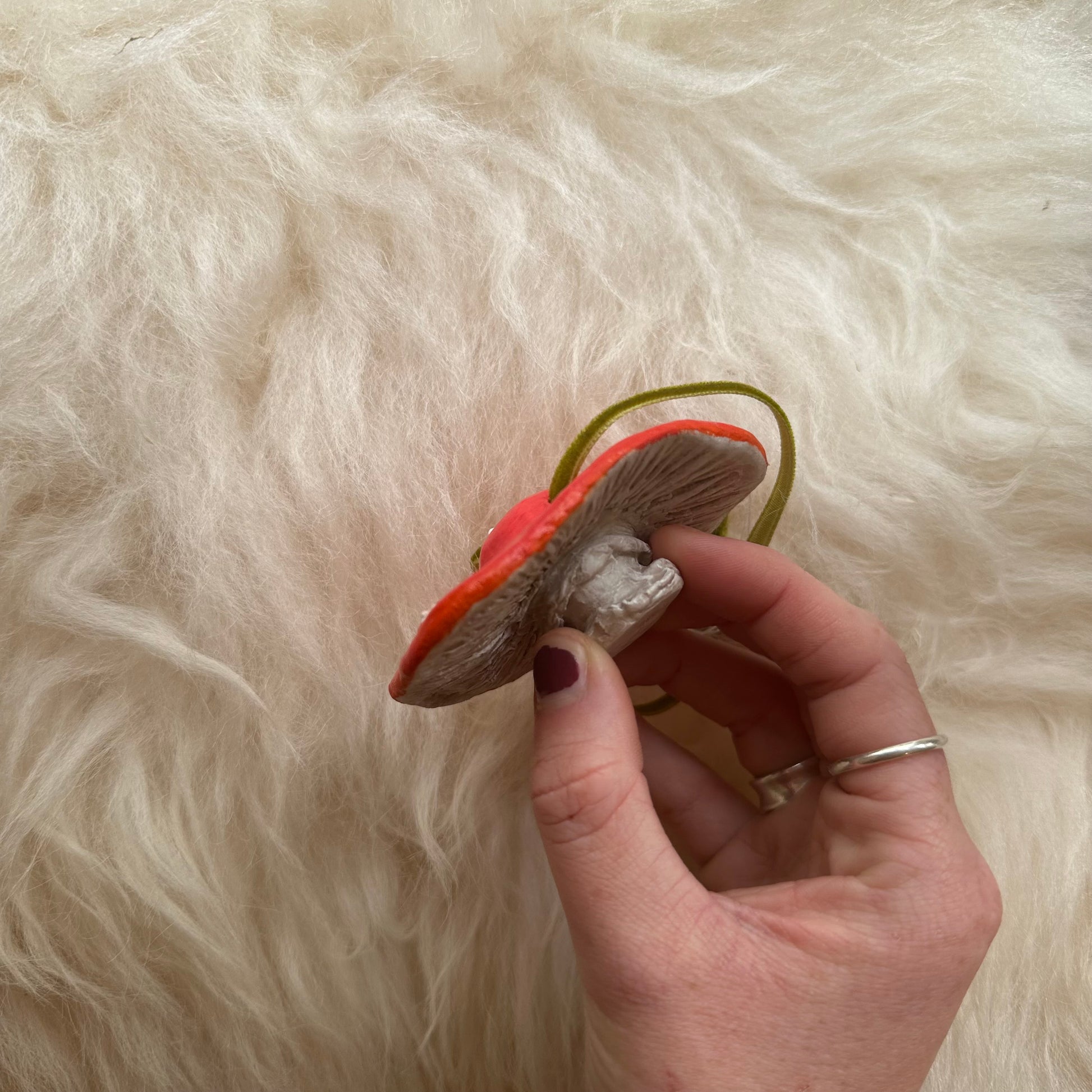 Handmade Mushroom Hanging Ornaments, with green velvet tie