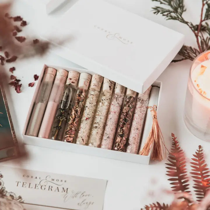 Create an enchanting beauty ritual with our petite apothecary artisan letterbox gift set. 100% raw and natural ingredients formulated In Cornwall and presented in 16ml glass tubes with cork lids. Enjoy the combinations to create your own perfect self-care routine.